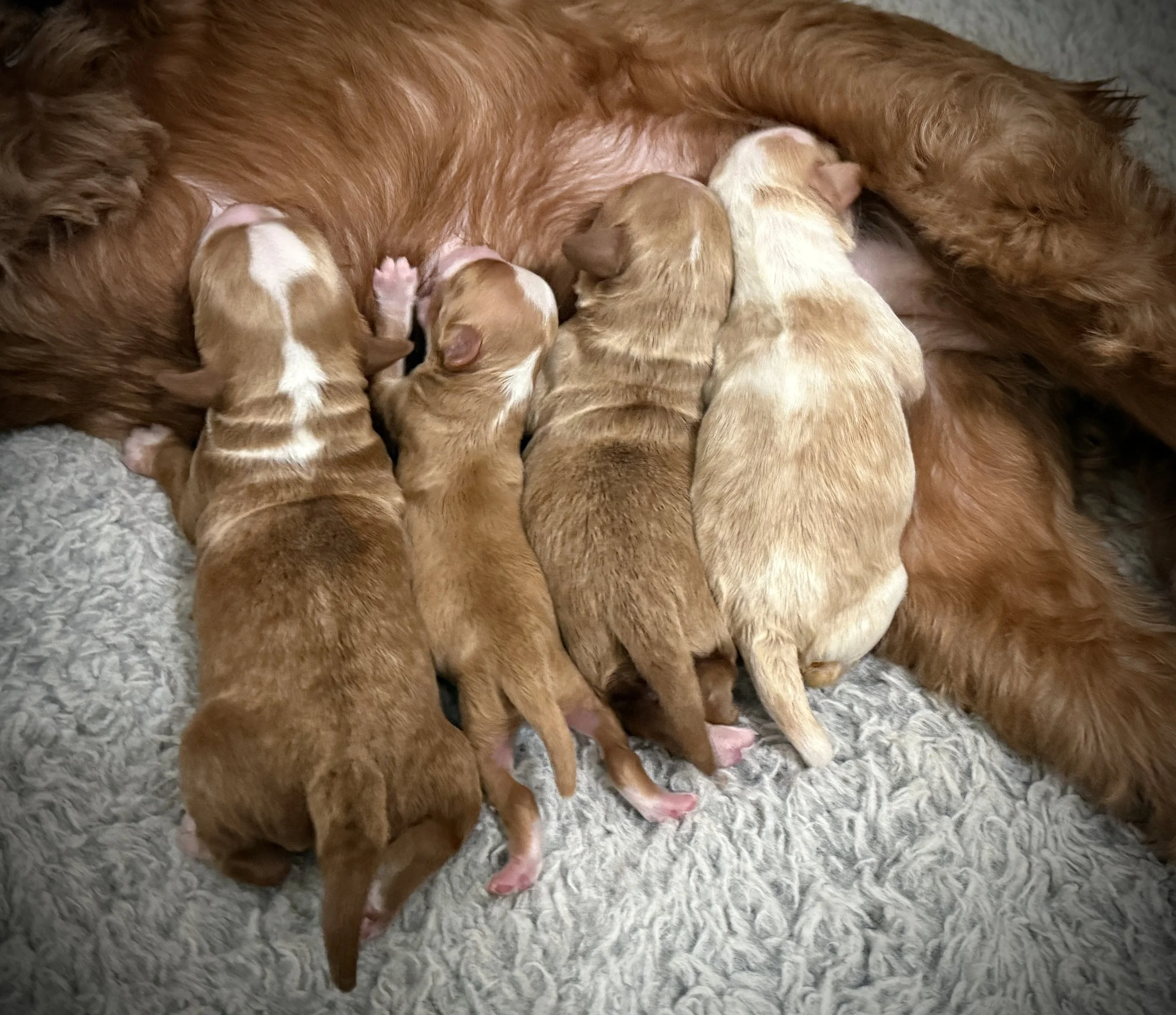 This is a repeat breeding between Koko & Louie because we absolutely fell in love with their previous pup! Koko’s pups will be ready to join their families January 2nd. All pups are apricot to caramel with big white markings on their chests. These pups are expected to weigh 18-28 lbs as adults.